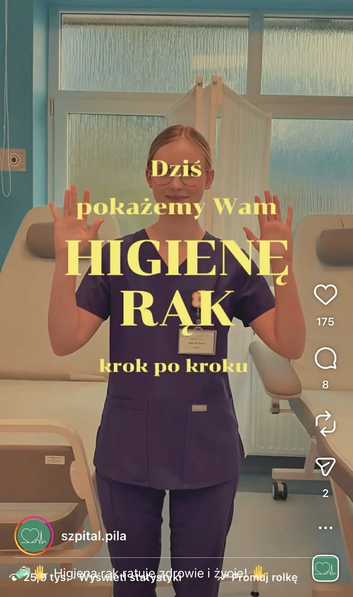 👉 Zobacz rolkę Szpitala Specjalistycznego w Pile, nagraną w stylu filmów Wesa Andersona. Opowiada historię – procedurę mycia rąk, po kroku – ale w estetyczny i trendujący sposób: